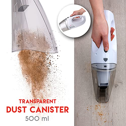 Transparent dust container: this handy vacuum cleaner is surprisingly powerful and has a 500 ml dust container. The tank is transparent so you can see immediately when it is full. Then simply click it out so you can empty it.