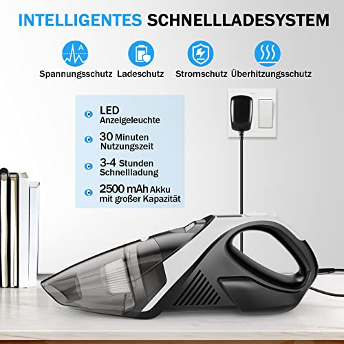 Quick charging and cleaning: car vacuum cleaner has intelligent 12.6 V fast charging technology, which only takes 3-4 hours and approx. 30 minutes. The LED light shows the charging status. Equipped with a premium washable double layer HEPA filter that disassembles for easy cleaning with one button.