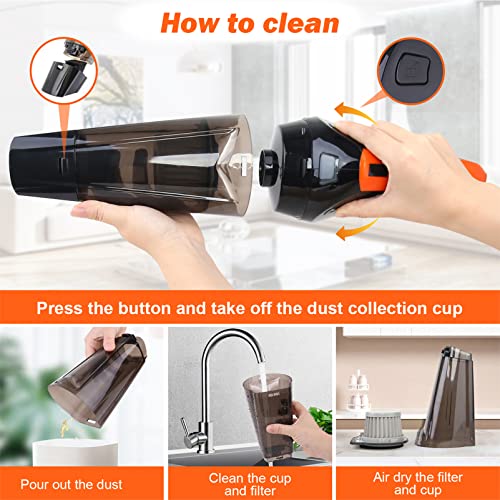 Strong suction power handheld vacuum cleaner: this small battery vacuum cleaner has a strong suction power of 6500 Pa. Strong suction power made by powerful motor, it easily sucks different types of fine dust. Lightweight handheld vacuum cleaner reliably absorbs ash/animal hair/crumbs/cat litter on carpets, tables, sofa, car seats etc.