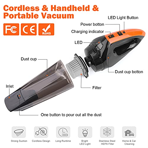Lightweight and portable and LED light design: this wireless handheld vacuum cleaner could free your movement for cleaning stairs, car, kitchen, office or hard-to-reach area without the annoying wires. The LED light on battery vacuum cleaner can illuminate the dark corners, making it easy to clean this difficult to see area.