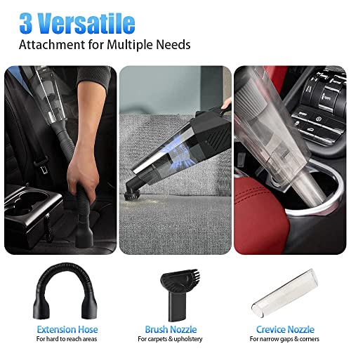 All-round cleaning: the handheld vacuum cleaner comes with 3 different nozzle types, transparent nozzle: for removing dirt in tight spaces, brush nozzle: for pet hair, extension hose: long enough to reach even hard-to-reach areas, the handheld vacuum cleaner meets all your daily cleaning requirements. (Filter is washable)