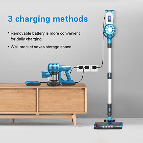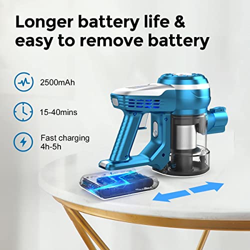 Strong suction power: the VICSOO wireless vacuum cleaner with a maximum power of 140 W. The 6 x 2500 mAh removable lithium battery provides up to 15 to 40 minutes of continuous cleaning experience. The area of continuous work can reach 150 square metres.